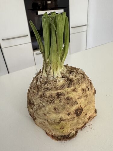 なんとブカッコウなお野菜でしょうか。 根セロリ・・・ この上部に普通のセロリがついています。 割るとこんな感じ ↓ そうそう、 ドイツのスーパーで売られている 『スープセット』 のアレです。 ドイツでは スープには欠かせない食材で、 例えばレンズ豆の…